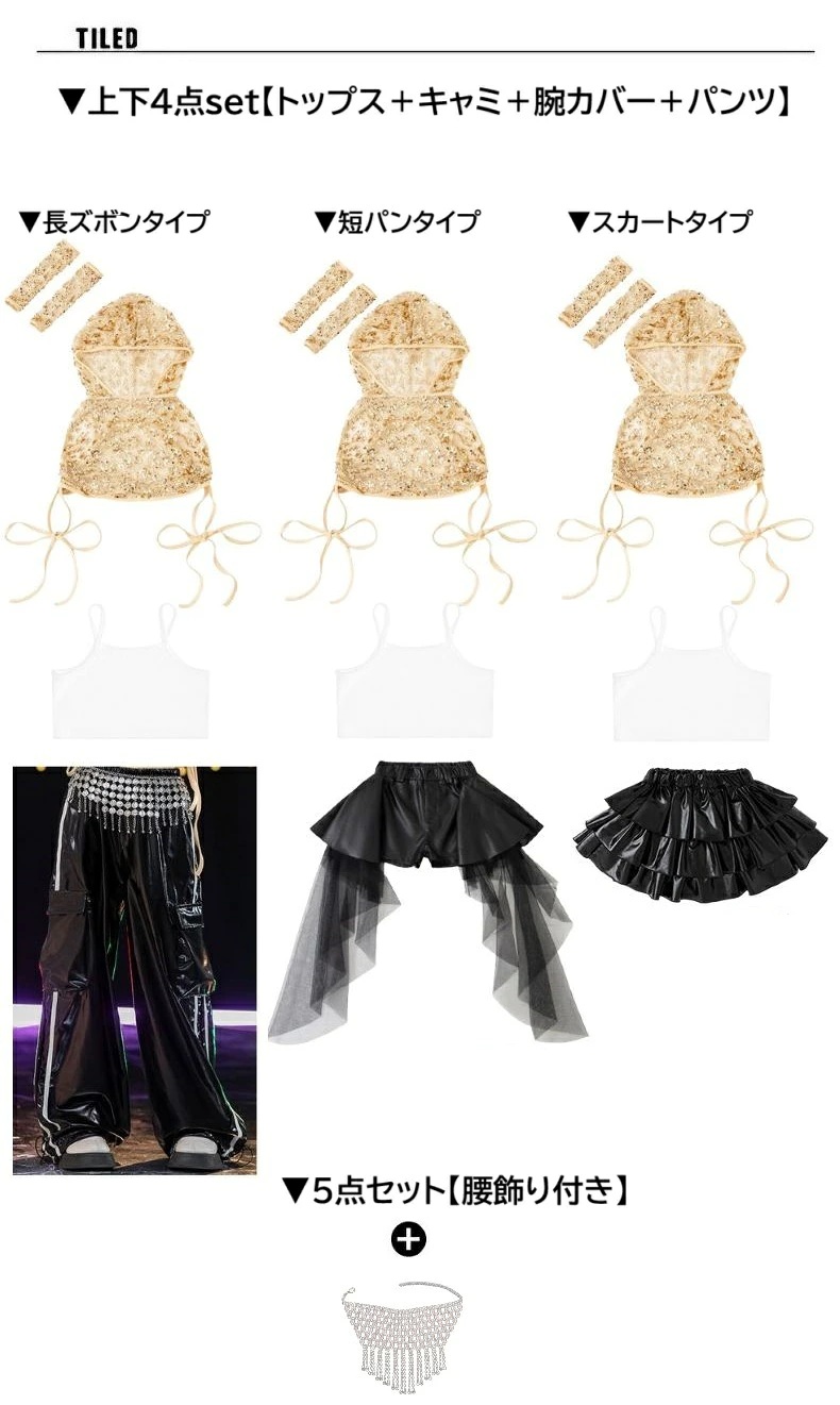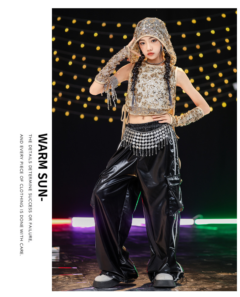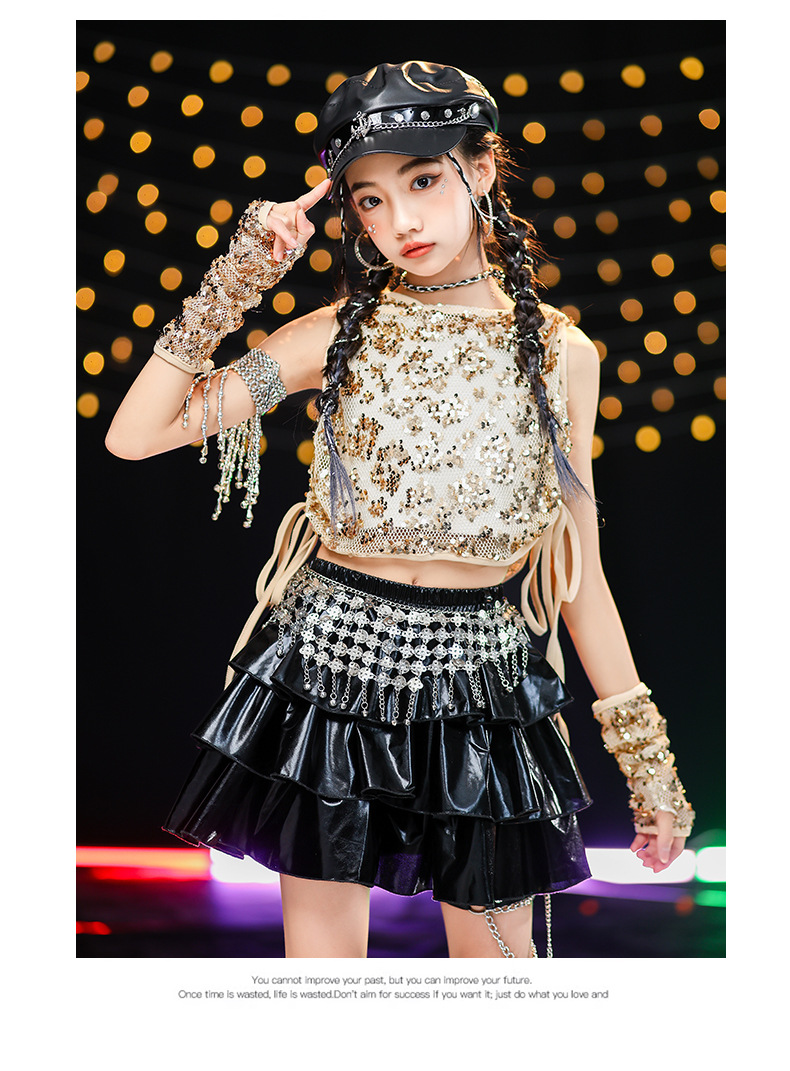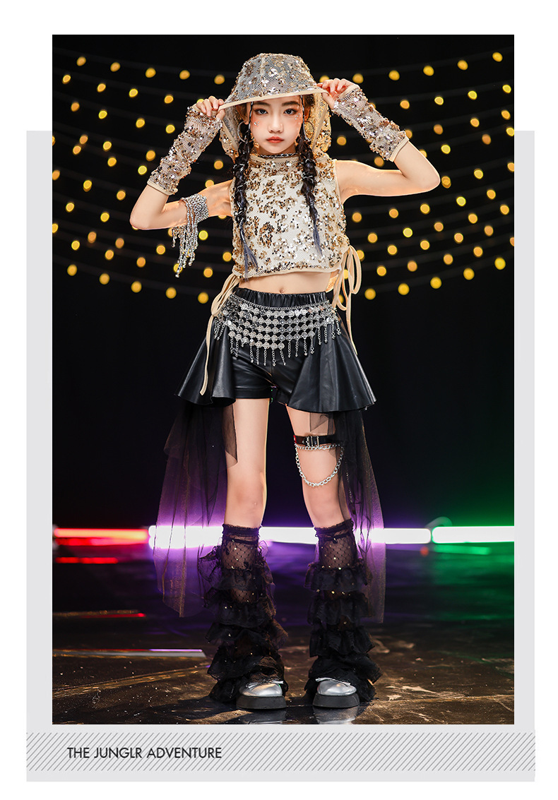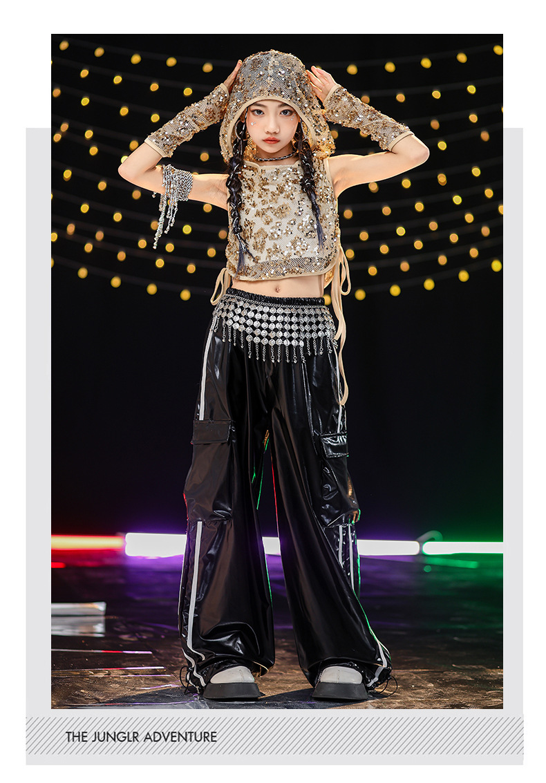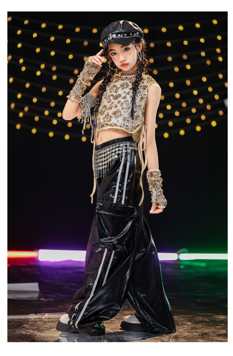 ダンス衣装 キッズ セットアップ K-POP 韓国 ガールズ ヒップホップ 衣装 ゴールド 黒 ヘソ出しトップス レザーパンツ キラキラ衣装 スパンコール 派手