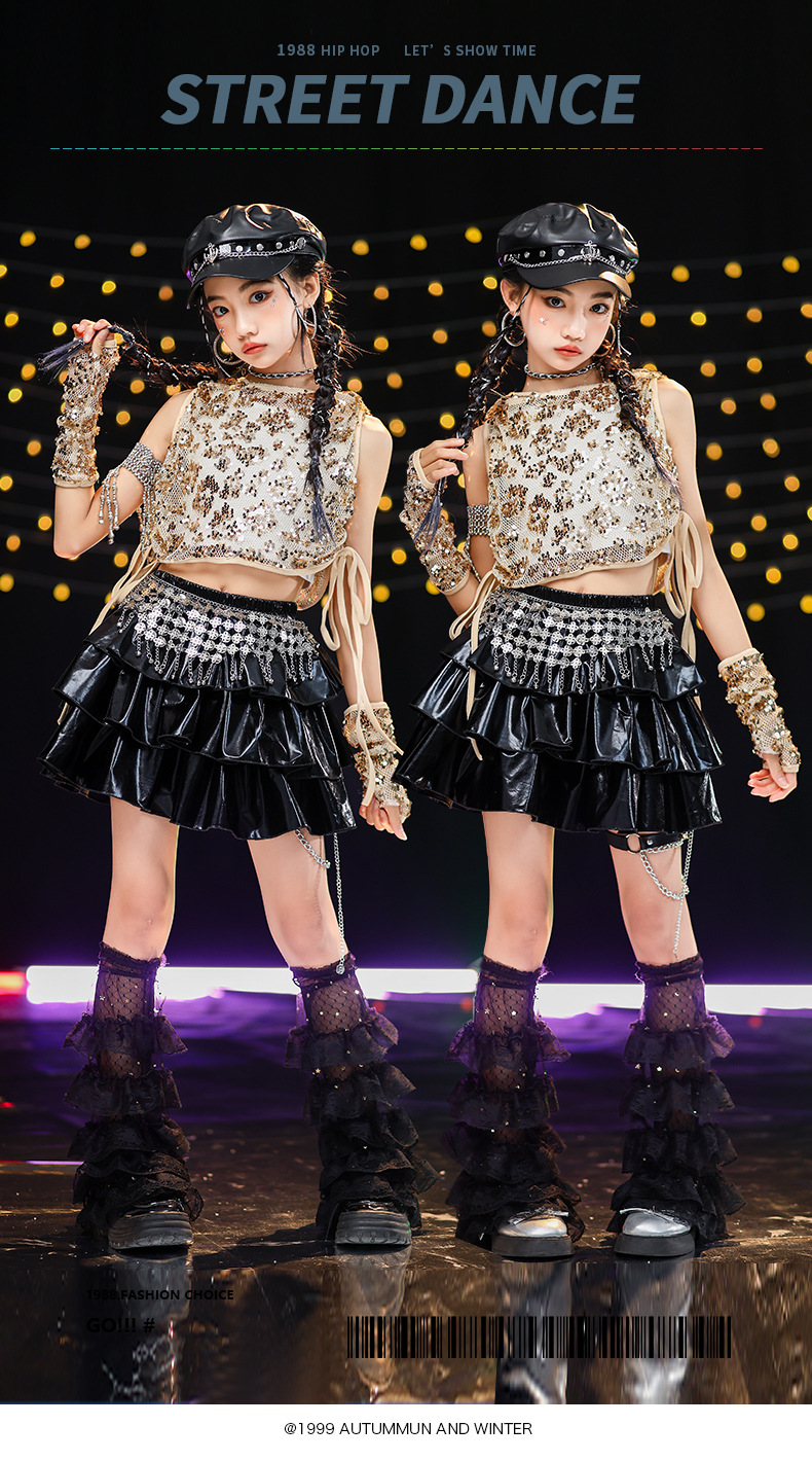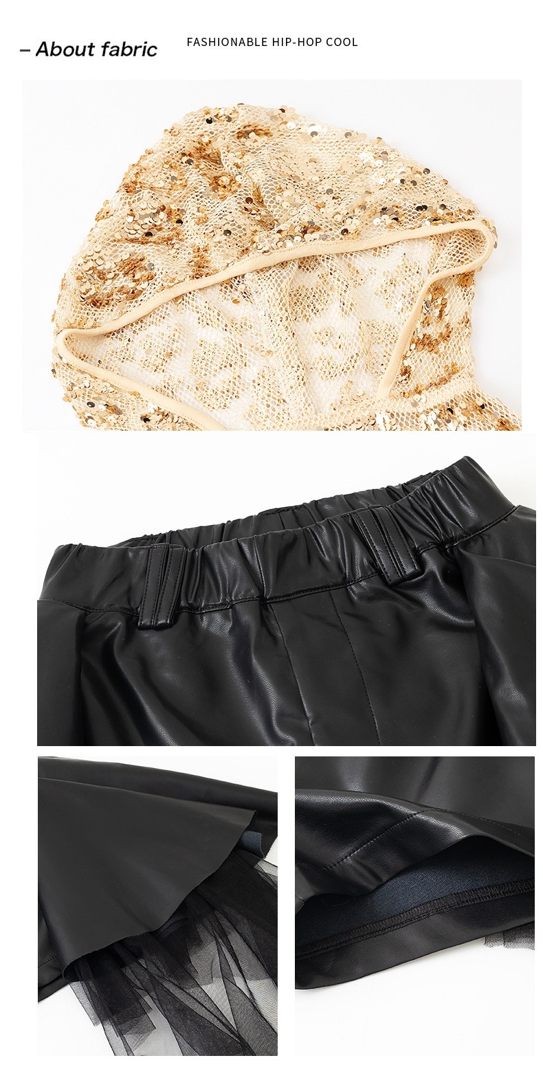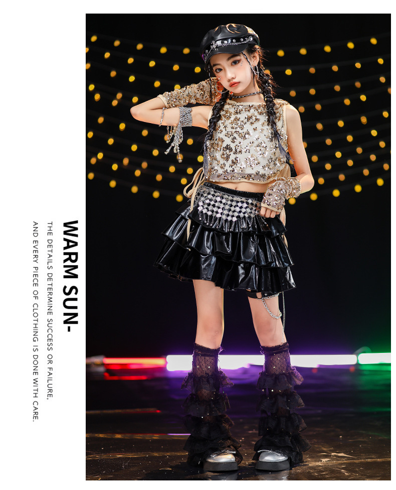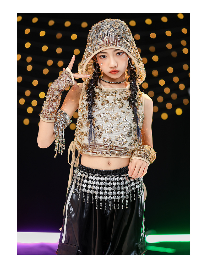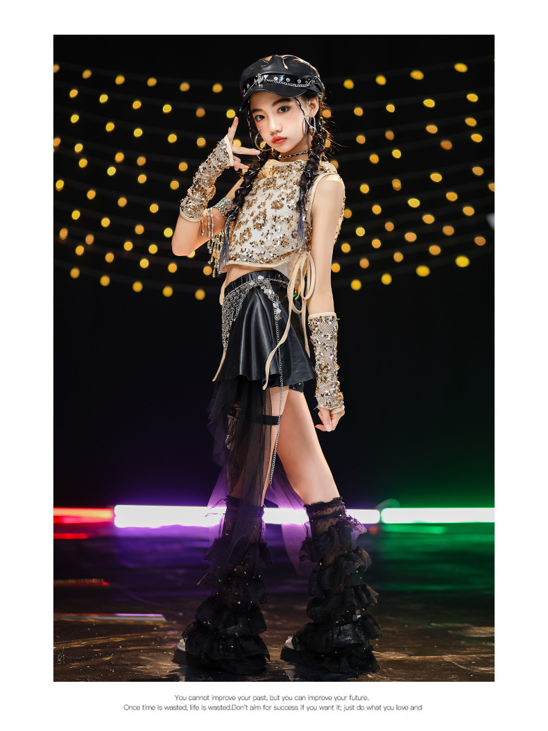ダンス衣装 キッズ セットアップ K-POP 韓国 ガールズ ヒップホップ 衣装 ゴールド 黒 ヘソ出しトップス レザーパンツ キラキラ衣装 スパンコール 派手