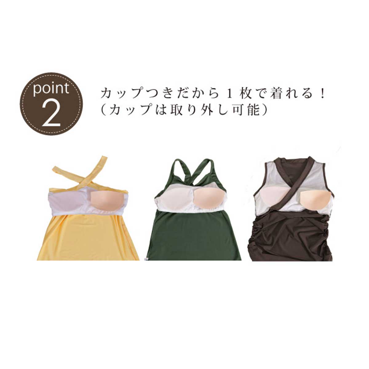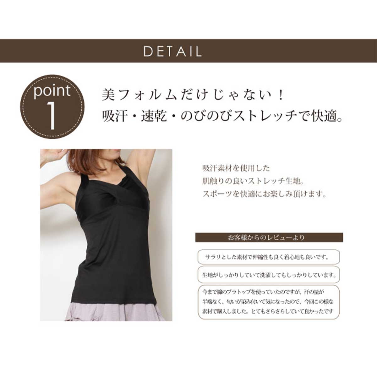 さり気ない胸元のツイストが文句なしにキュートな愛されキャミ。バスト部分をツイストさせることによって、胸元に華やかさが生まれるだけでなく、胸の形をキレイに見せてくれる秀逸なデザイン。バックスタイルは曲線的なストラップがとても印象的で、前から見たキュートさと背中から見たクールさが共存した二面性が魅力的。背中は広めに開いていますが、ストラップが太めで広めにカバーしているので安定感があります。