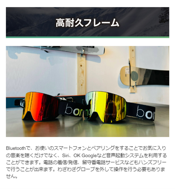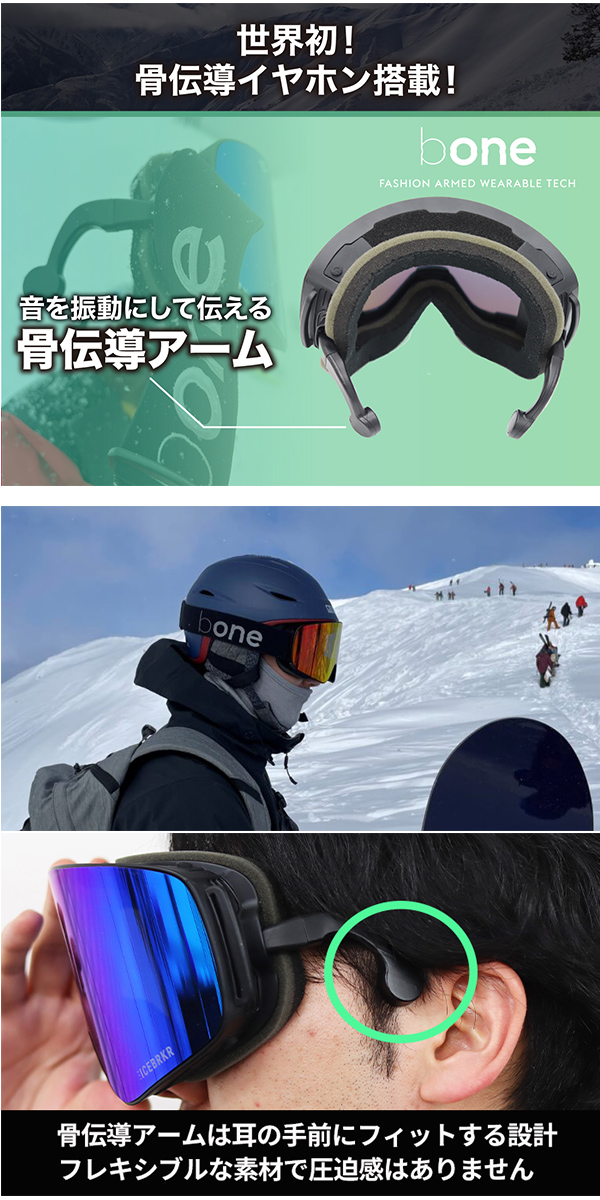 bone(ビーワン)は、Bluetooth 5.0 MESHインカムテクノロジーと骨伝導オーディオを搭載したスノーゴーグルです。