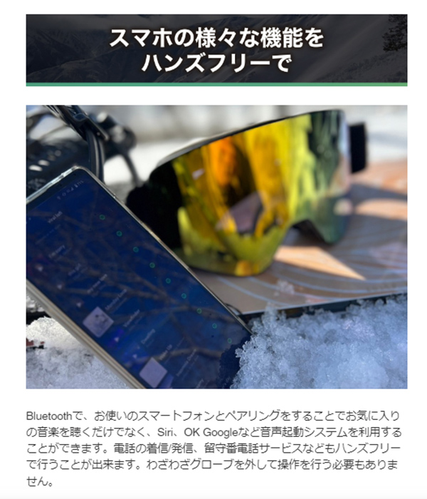 ゲレンデのどちらのコースを選ぶか、バックカントリーのドロップやキッカーでのスタートの合図、リフトから仲間の滑りを見てるときなど、スノーボード・スキー中も気軽に仲間との会話できたらもっと楽しくなるはず。
