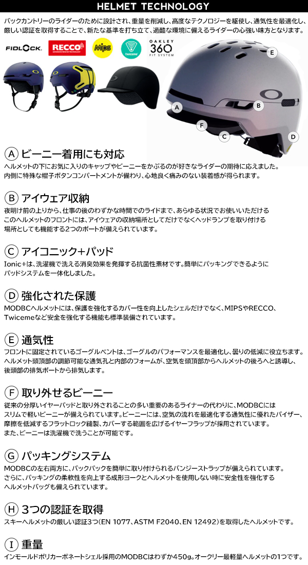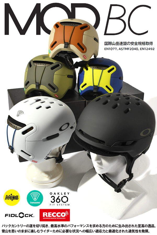 重量、通気性、フィット感、 安全性を重視して開発された「MOD BC」。ゲレンデからバックカントリーまで、様々なスノー シーンに対応するオールラウンドモデル。軽量かつ耐久性の高いポリカーボネートシェルでEPSフォームライナーを包んだ最も軽量なインモールド構造。BOAに代わる、オークリー独自開発の360度フィットシステム。TwiceMe、Reccoテクノロジーを採用し、救助者がライダーをより迅速かつ効率的に追跡。前頭部・頭頂部・後頭部にベンチレーションホール。体温で上昇したエアーを逃がし、ライダーの体温上昇を防ぎます。通常のライナーパッド・イヤーパッドの代わりに薄くて軽く、通気性が良いビーニーライナーが付属。国際山岳連盟の安全規格取得(EN1077、ASTMF2040、EN12492)