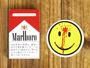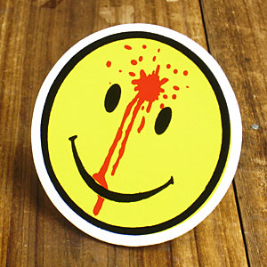 額を銃で撃ち抜かれたようなニコちゃんマーク!映画「ウォッチメン」でも似たようなデザインが登場しましたね!