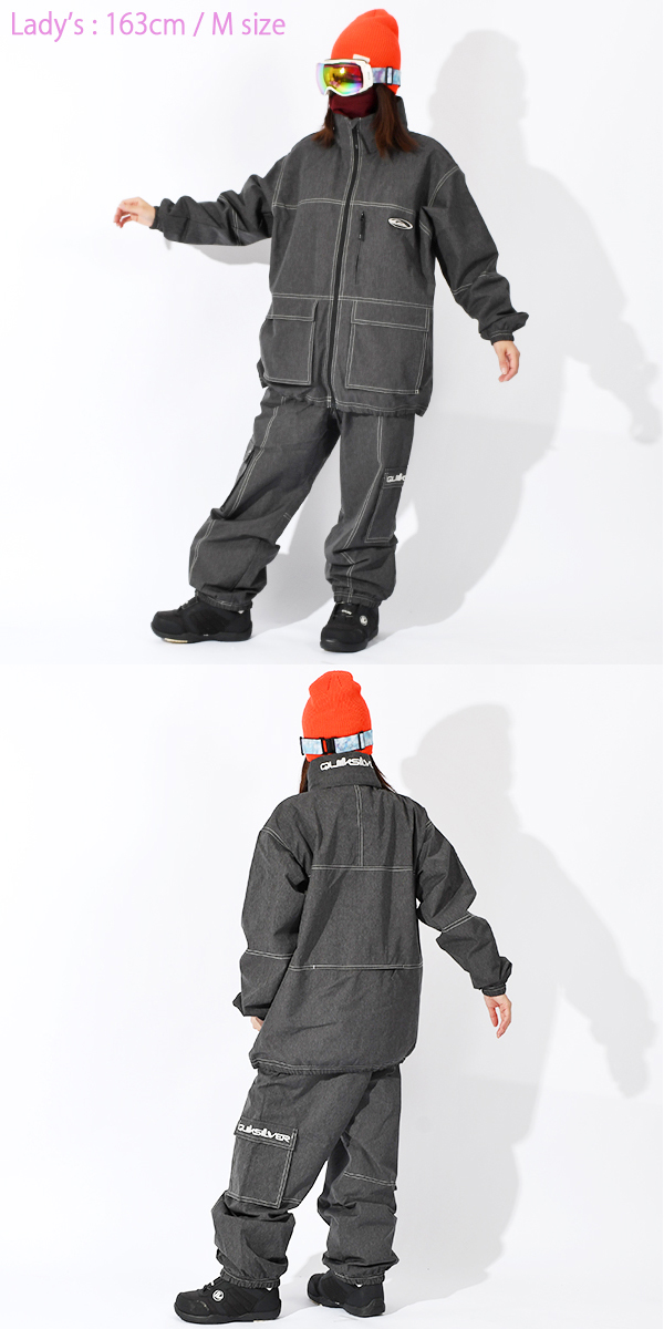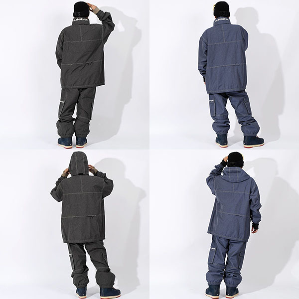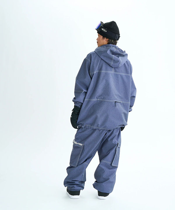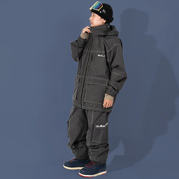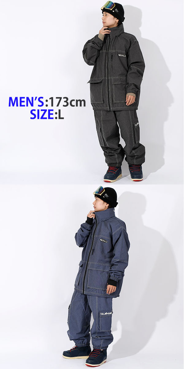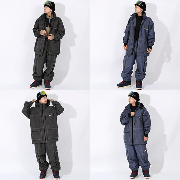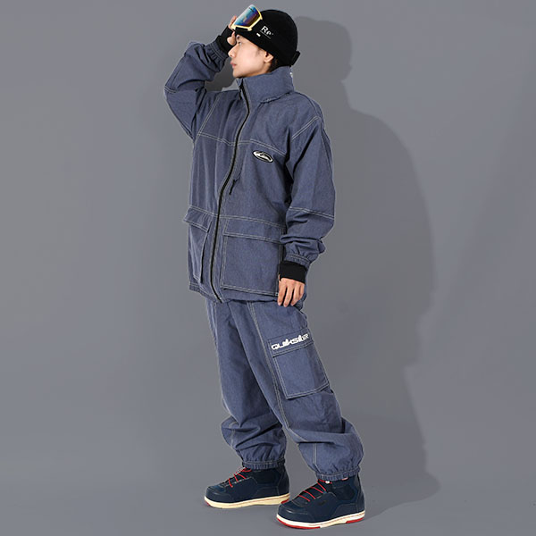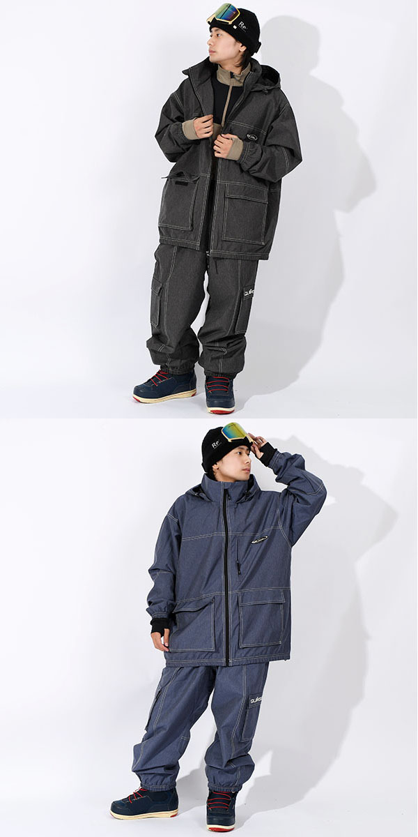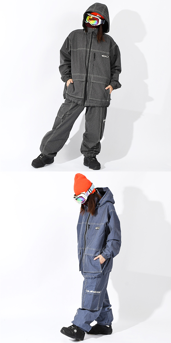 デニムライクな素材とステッチワークがアクセントで、男女問わず上下セットでの着用がおすすめです。