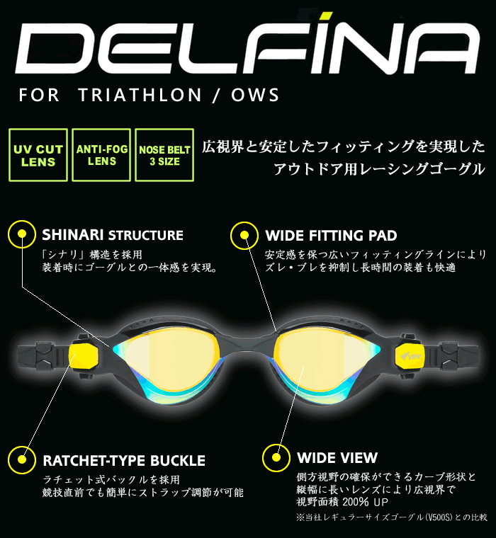 FINA承認モデル クッションあり アウトドア競泳用スイムゴーグル OWS オープンウォーター 水泳用 ミラーレンズ DELFINA VIEW ビュー V2000SAM