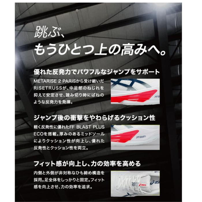 METARISE 2から受け継いだRISETRUSSとFF BLAST PLUS ECOが中足部のねじれを安定させ、ジャンプ後の衝撃をやわらげるクッション性を発揮することで、よりパワフルなジャンプを可能にします。