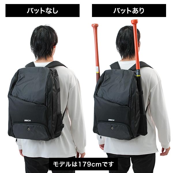 2本のバットをしっかり収納!シューズの別収納やフェンスフックなど、野球プレイヤーの"欲しい"を詰め込んだ多機能バックパック。