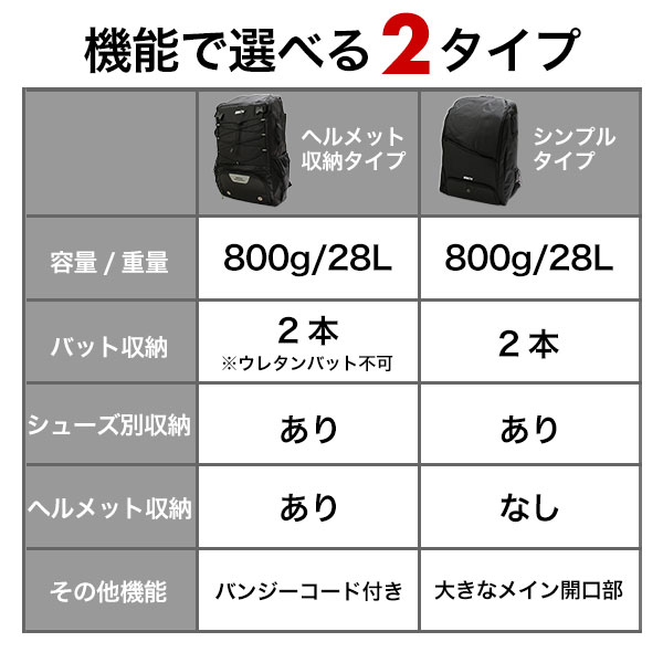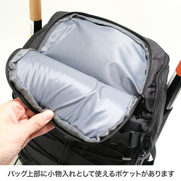 グラブ・スパイク・バット2本・ヘルメットをひとまとめに収納できる多機能リュック。