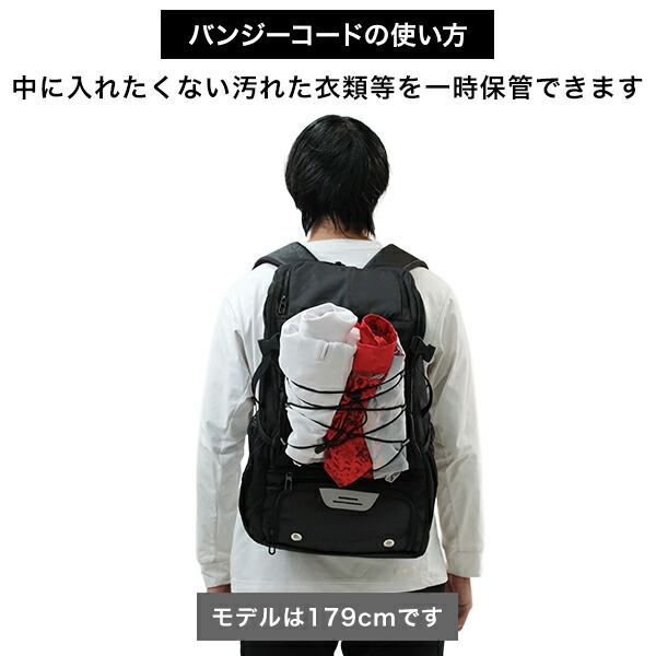 リュック外側にバンジーコードもついており、汚れた衣類等、バッグの中に入れたくないものを一時的にホールドすることも可能、