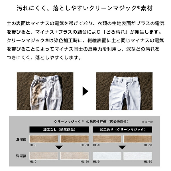 クリーンマジックは染色加工時に、繊維表面に土と同じマイナスの電気を帯びることによってマイナス同士の反発力を利用し、泥などの汚れをつきにくく、落としやすくします。