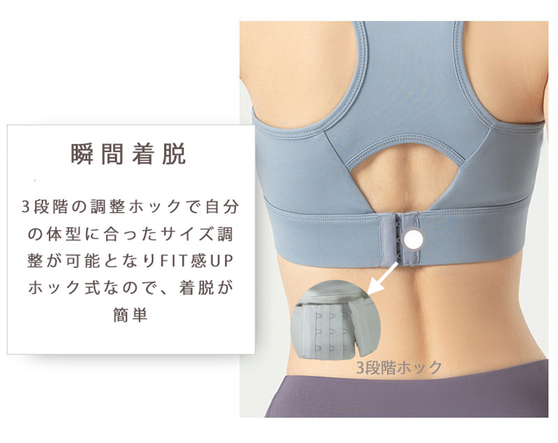 ●3段階式の後ろホックタイプでサイズの微調整が可能です。着脱が簡単